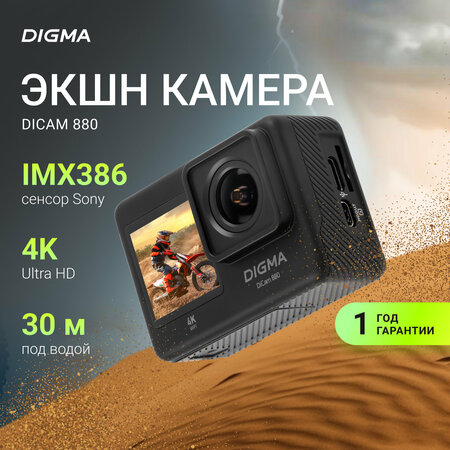 Экшн-камера Digma DiCam 880 — универсальное цифровое устройство для съёмки ярких моментов в самых разных условиях: в воздухе, под водой или на суше. Камера сочетает продвинутые технические возможности, продуманную эргономику и стильный дизайн. Качество изображения и видео Разрешение 16 Мп обеспечивает чёткость фото. Гибкая настройка картинки: ручная и автоматическая регулировка баланса белого, автоэкспозиция — для насыщенных и детализированных кадров. Высокое разрешение видео: запись в 4К (3840 × 2160 pix) с частотой 60 к/с. Специальные режимы: замедленная съёмка (Slo‑Mo): Full HD при 120 к/с или HD при 240 к/с; Time‑lapse: сжатие многочасовой съёмки в короткий ролик; циклическая, высокоскоростная, перевёрнутая видеосъёмка; автоматическая интервальная и серийная фотосъёмка. Широкий угол обзора 170° позволяет захватить больше деталей и пространства в кадре. Стабильность и удобство съёмки Электронная стабилизация изображения устраняет эффект «тряски» — идеально для съёмки на ходу (например, во время езды на велосипеде или самокате). Два экрана для комфортного управления: передний цветной экран (1,3″) — удобен для селфи; встроенный LCD‑дисплей (2″, разрешение 320 × 240) — позволяет детально просматривать отснятый материал. Подключение и передача данных Wi‑Fi: быстрая передача файлов на смартфон и управление камерой через фирменное приложение. Разъёмы: microUSB — для подключения к компьютеру и зарядки; microHDMI — для вывода изображения на телевизор. Совместимость с ПК/ноутбуком: камеру можно использовать как веб‑камеру высокого разрешения для онлайн‑конференций и стримов. Питание и автономность Аккумулятор Li‑Pol 900 мАч обеспечивает автономную работу.