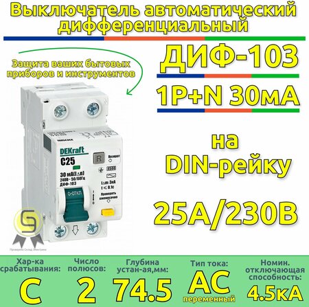 Дифференциальный автомат 2Р 25А 30мА 4,5кА 1Р+N С ДИФ-103 DEKraft - это надежное и эффективное устройство, сочетающее в себе функции автоматического выключателя и устройства защитного отключения. Автоматические выключатели дифференциального тока серии ДИФ-103 DEKraft обеспечивают три вида защиты: от короткого замыкания, перегрузки и возникновения утечки тока. Они применяются в распределительных, учётно-распределительных, телекоммуникационных щитах и других объектах в жилищном, гражданском строительстве, сельском хозяйстве и инфраструктуре объектов промышленности. Дифференциальный автомат имеет номинальный ток 25А, номинальный дифференциальный ток 30мА и отключающую способность 4,5кА. Он оснащен электромеханическим принципом работы и типом расцепления C. Устройство имеет 1 модуль и напряжение 230В. Соответствие стандартам: ТР ТС 004 / 2011, ТР ТС 020 / 2011, ТР еаэс 037 / 2016, ГОСТ IEC 61009-1. Дополнительная информация: номинальный отключающий дифференциальный ток IΔn - 30мА, номинальная частота сети переменного тока - 50/60Гц, номинальная отключающая способность Icn - 4500А, рабочая отключающая способность Ics - 4500А, механическая износостойкость - 4000 циклов В-О, коммутационная износостойкость - 4000 циклов В-О, номинальное напряжение по изоляции Ui - 500В, номинальное импульсное выдерживаемое напряжение Uimp - 4000В, диапазон рабочих температур - от -40 до +60°C, максимальное сечение подключаемого провода - 25мм2, усилие затяжки клеммных зажимов - 2,0Н·м. Выбирая дифференциальный автомат 2Р 25А 30мА 4,5кА 1Р+N С ДИФ-103 DEKraft, вы получаете надежное и качественное устройство, которое обеспечит вашу безопасность и комфорт в использовании.