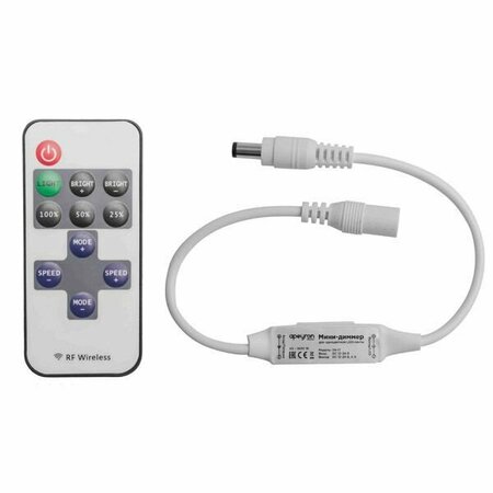 Мини-диммер 04-10 предназначен для управления монохромной светодиодной лентой 12/24 В. С помощью него можно включать или выключать светодиодную ленту, отрегулировать ее яркость, а также использовать различные динамические режимы и отрегулировать скорость их работы. Прибор может работать как от напряжения 12 В, так и 24 В. Важно отметить, что в зависимости от того с каким напряжением предстоит работать устройству, будет отличаться и максимальная мощность нагрузки, которую можно подключить к нему. Так, при напряжении 12 В максимальная нагрузка будет равна 72 Вт, а при напряжении 24 В уже 144 Вт. Дистанционный пульт управления передает сигнал по радиоканалу, благодаря чему сам прибор можно убрать из зоны видимости без потери сигнала от пульта. Управление осуществляется с помощью кнопок, расположенных на лицевой стороне пульта, который работает от 1-й батарейки CR2025 (батарейка в комплект не входит). Накладной корпус, выполненный из пластика , благодаря миниатюрному размеру 40х12х5 мм, позволяет разместить его даже в профиле для светодиодной ленты. Степень защиты от пыли и влаги соответствует стандарту IP20, что подразумевает установку устройства в сухом, проветриваемом помещении. Преимущества: - Компактный кнопочный пульт; - Передача сигнала по радиоканалу; - Возможность с помощью освещения создать собственную неповторимую атмосферу; - Компактные размеры; - Регулировка яркости; - Динамические режимы; - Легок в подключении благодаря коннекторам на проводах; - Регулировка скорости в динамических режимах. Входное напряжение 12/24В Гарантия 1 год Мощность 72Вт при 12В/144Вт при 24В Количество кнопок на пульте, шт. Кнопочный пульт (11 кнопок) Подключаемое оборудование Монохромная светодиодная лента 12/24В Связь пульт/контроллер RF радио Способ монтажа накладной Ток нагрузки 1*6А Материал корпуса пластик Размеры, мм 40х12х5мм Степень пылевлагозащиты IP20