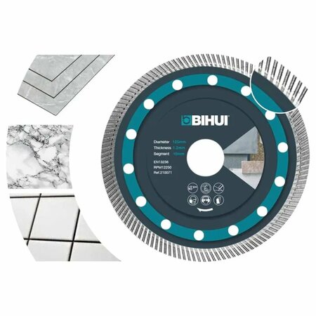 Диск алмазный BIHUI "SUPER THIN TURBO" 125мм DCBN5 - это тонкий и эффективный инструмент для резки твердой плитки, такой как керамогранит, фарфор и камень. Он идеально подходит для профессиональных строителей, реставраторов и домашних мастеров, ценящих точность и минимизацию отходов материала. Толщина диска 1.2 мм позволяет производить чистые и аккуратные разрезы с минимальными отколами. Алмазный край шириной 9 мм обеспечивает высокую скорость резки и длительный срок службы. Возможность использования для влажной и сухой резки делает этот диск универсальным для различных условий работы.