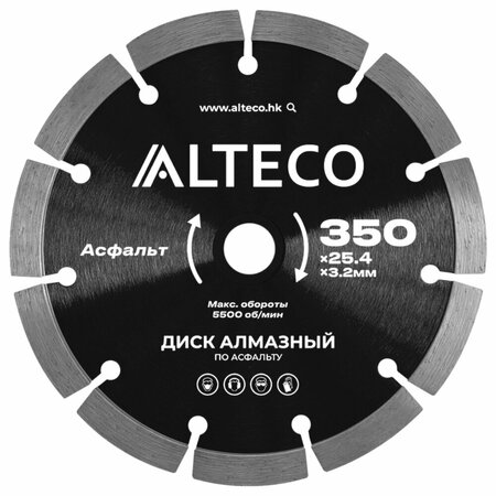Диск алмазный ALTECO 350x25.4x3.2 мм - применяется для сухого реза по асфальту. Толщина алмазного сегмента - 3.2 мм. Внимание! При эксплуатации алмазного диска необходимо соблюдать технику безопасности и меры предосторожности. Сухой рез - диск может выполнять рез как без охлаждающей жидкости, так и с ней. Благодаря охлаждению режущая оснастка прослужит дольше. *Внимание, изображение товара может отличаться от реального! Правильные параметры указаны в технических характеристиках товара.
