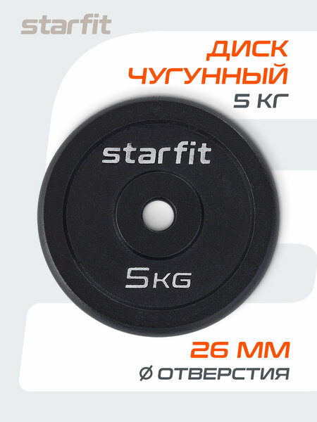 Блин для штанги чугунный STARFIT, вес 5 кг, d=26 мм, цвет черный
