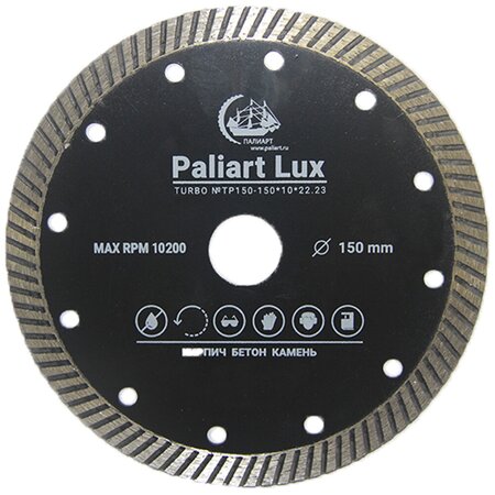 Диск отрезной алмазный 150x22 Турбо Paliart LUX - это профессиональный инструмент для строительных работ, который обеспечивает высокую производительность и долговечность. Особенностью данного диска является разделение режущей поверхности на сегменты. Это позволяет отводить отработанный материал и способствует дополнительному охлаждению, что увеличивает срок службы диска и обеспечивает стабильную работу. Диск предназначен для резки высоко- и среднеабразивных материалов, таких как бетон, кирпич, тротуарная плитка, бордюрного камня и абразивного мрамора. Диаметр диска составляет 150 мм, а максимальное количество оборотов - 10200 об/мин. Посадочный диаметр диска равен 22,23 мм. Тип алмазного диска - турбо, что обеспечивает высокую скорость и точность резки. Выбирая диск отрезной алмазный 150x22 Турбо Paliart LUX, вы получаете надежный и качественный инструмент для выполнения строительных работ.