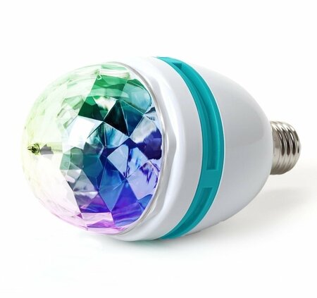 LED лампа «Диско» поможет Вам устроить незабываемый романтический вечер, яркий детский праздник или домашнюю дискотеку. Лампа создаст атмосферу танцпола ночного клуба в любом помещении, сияя зелеными, синими, красными, розовыми огоньками. Для использования лампы, ее нужно зафиксировать в плафоне, она подходит для обыкновенной люстры или светильника со стандартным патроном. Светодиоды, размещенные внутри лампы, загорятся, а прозрачный ограненный купол начнет вращаться. Лампа имеет стандартный патрон Е27 и может устанавливаться как на потолочное, так и на настенное крепление. Осветит помещение до 20 квадратных метров. Благодаря компактным размерам светящуюся LED лампу удобно взять на дачу, в детский сад на утренник или в школу, на корпоратив в офис. Отлично подходит в качестве подарка!