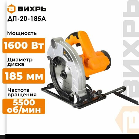 Пила дисковая (циркулярная) вихрь – ручной электроинструмент для прямолинейного распила дерева, а при использовании специальных пильных дисков можно качественно и быстро раскраивать плотные листовые материалы (ламинат, бакелитовую или обычную фанеру), цветные металлы, пластик. Дисковые пилы относятся к технике с приводом от электрического двигателя. Двигатель через редуктор передает крутящий момент на пильный диск. Дисковая пила Вихрь ДП-20-185А - cредняя по мощности пила, позволяет делать пропил глубиной до 65 мм. Небольшой вес и размер гарантируют удобство при транспортировке. Преимущества: