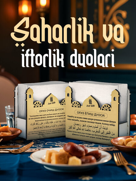 Краткое описание: Исламская салфетница для месяца Рамадан с возможностью размещения салфеток. На одной стороне — дуа для разговения (ифтара), на другой стороне — дуа для сухура (закрытие поста). Отлично подходит для ифтарного стола. Подробное описание: Данная салфетница создана специально для использования в благословенный месяц Рамадан. Она сочетает в себе практичность и духовную ценность. Благодаря двустороннему оформлению, дуа всегда будут перед глазами во время ифтара и сухура. Салфетница компактная, устойчивая и красиво смотрится на праздничном дастархане, столе или полке. Также прекрасно подойдёт в качестве подарка. Одна сторона: — Дуа для разговения (ифтара) Вторая сторона: — Дуа для сухура Характеристики: Тип товара: настольная салфетница Тематика: Рамадан, исламские дуа Материал: дерево / МДФ Цвет: светлый, исламский стиль Функция: держатель для салфеток Назначение: дом, офис, подарок Состояние: новое Комплектация: 1 штука Подходит для: Мусульманских семей Ифтарного стола в Рамадан Подарка близким и друзьям Ключевые слова (SEO): Салфетница Рамадан, дуа ифтар, дуа сухур, исламская салфетница, исламский декор, подарок мусульманам, ифтар стол