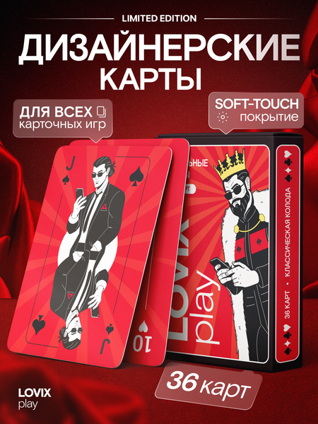 Игральные карты LOVIX — стильный апгрейд классики. Свежий взгляд на знакомые игры: яркий, смелый дизайн, приятное на ощупь soft-touch покрытие и максимум удовольствия от каждой раздачи. Эти карты хочется держать в руках и показывать друзьям. В наборе: ▪ 36 карт (от шестерки до туза каждой масти). ▪ Удобный размер: 97 × 70 мм. ▪ Прочные, гибкие, не залипают и легко тасуются. ▪ Матовое софт-тач покрытие — приятно держать и удобно играть. Подходят для всего: ▪ Все хиты: «Дурак», «Преферанс», «Пьяница», «Двадцать одно», «Пасьянс» и др. ▪ также карты подходят для фокусов. Удобный формат — берите с собой в дорогу, на пикник или в путешествие. Игральные карты LOVIX отличная идея для подарка — красиво, практично и недорого. LOVIX play — привычные правила, новые впечатления. Колода, которая выглядит так же круто, как и играется.