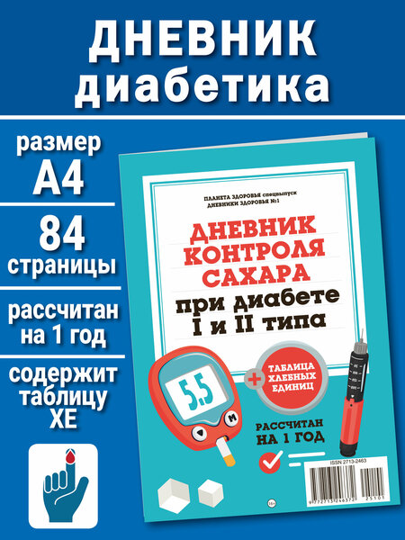 Дневник самоконтроля сахара для диабетиков 1 и 2 типа. Помимо таблиц наш ежедневник контроля сахара в крови содержит полезную информацию для людей, болеющих сахарным диабетом: как правильно сделать инъекцию инсулина, как рассчитать хлебные единицы в блюде и др. Дневник универсален и подходит для любого пола и возраста. Рассчитан на 1 календарный год. Наш дневник станет незаменимым помощником людям, которым хорошо знакомы такие понятия как инсулин, лекарства от диабета, хлебные единицы, глюкометр, тест-полоски, товары для диабетиков, продукты для диабетиков, конфеты без сахара для диабетиков, сладости для диабетиков, шоколад без сахара для диабетиков, печенье для диабетиков, диабетические продукты, сироп топинамбура и т. п. Формат А4. 84 страницы (80+4 обложка). Обложка мелованная. Бумага внутри - типографская ч/б. 16+