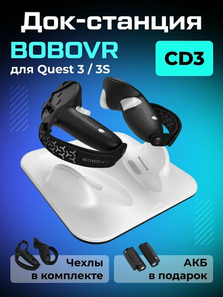 Док-станция BOBOVR CD3 для контроллеров Oculus Quest 3 / 3S — это современное и удобное решение для беспроводной зарядки и аккуратного хранения ваших VR-контроллеров. Созданная специально для аксессуаров Quest 3 и 3S, она обеспечивает комфорт, стиль и максимальную функциональность. Беспроводная зарядка и держатели контроллеров BOBOVR CD3 объединяет в себе зарядную док-станцию и держатели для контроллеров, что делает процесс подзарядки максимально простым и эстетичным. Просто установите контроллеры на базу — и зарядка начнется автоматически, без проводов и лишних действий. Мгновенная и удобная зарядка В комплект входят перезаряжаемые литиевые батареи и специальные держатели для контроллеров G3, обеспечивающие надежный контакт и стабильную подачу энергии. Вам больше не нужно менять батарейки — просто поставьте контроллеры на место после игры. Долговечные аккумуляторы Каждая док-станция комплектуется специальными литиевыми аккумуляторами, рассчитанными на более 30 часов непрерывной работы. Это идеальное решение для активных пользователей VR, которые не хотят беспокоиться о постоянной подзарядке или замене элементов питания. Точный контроль уровня зарядки Интуитивно понятные LED-индикаторы четко отображают статус зарядки каждого устройства. Вы всегда будете знать, когда контроллеры полностью готовы к следующему VR-сеансу. Минималистичный дизайн BOBOVR CD3 выполнена в лаконичном и современном стиле, который гармонично сочетается с гарнитурами Quest и другими аксессуарами BOBOVR. Компактная форма и аккуратная организация пространства позволяют использовать станцию даже на небольшом столе. Преимущества BOBOVR CD3: