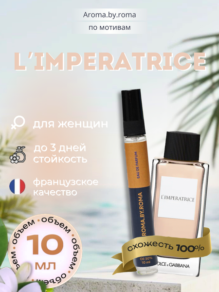 {"widgets":{"@light/ProductM2bEdoOnlyBadge":{"/content/page/fancyPage/defaultPage/m2bEdoOnlyBadge":{"wrapperProps":{"margins":{"top":"2"}},"isM2bEdoOnlyEnable":false}}},"meta":{"/content/page/fancyPage/defaultPage/m2bEdoOnlyBadge":{"name":"@light/ProductM2bEdoOnlyBadge"}},"collections":{"views":{"defaultOffer":"vi_7984585419294070268_bi_6200634880578094839"},"viewItem":{"vi_7984585419294070268_bi_6200634880578094839":{"id":"vi_7984585419294070268_bi_6200634880578094839","composeId":"7984585419294070268","buyOptionId":"bi_6200634880578094839"}},"buyOption":{"bi_6200634880578094839":{"id":"bi_6200634880578094839","title":"Женские духи \"L’Imperatrice\", Dolce & Gabbana, распив, в пробнике, 10мл","offerId":"_TawFEEGIuokva1-kv63bw","slug":"dolce-limperatrice","trackingLinks":{"cpa":"/lGa6VHEc91Y8oQ1MlOwS4CQEAGOD","promotionUrl":"/xBDpuaGMLWM_vyAa-AoVahfSp5zU"},"skuId":"4555011693","productId":"1309157233","categoryId":"15927546","navnodeId":"16677491","departmentId":"54438","showUid":"17714514720942880867406001","counterStep":1,"minimum":1,"maximum":5,"price":{"value":38000,"currency":"UZS"},"vendorId":"15728405","feeShow":"OTNDnItfwRMlLJby2gHopZCyC0XwZ_hL2AEXqtdE9n27IVSNpAEh_Xpep3dQiNKFk2JzzZFBdLWqe3CZr5qARpNeBtSvNGngNAwMTcX9fIMNc76fZLW4qYJZ2Mxo45X-EuDPTM3mDcye38d-T0PG1s4LBVvIebi9fXiB65w844eFIF0V7B2Gaf2dAfJAICo_whfviz-BEm8y6gDFE2N1zvE0jopvh2WX8QHtCVZZWox6HPT5gAaOr4fP0jbA7nFAhtUEip-kckcLf1_WOXf1SjfpZpaAIAq2_DCqowgnzxY0JOE60CKMH0IHbPOJageHeXZvxAteD6YDwX_hngfXfA,,","feedId":"52256937","feedOfferId":"52256937.AROMABR-DOLCELIMPERATRICE10","shopId":"431782","supplierId":"201341879","businessId":"186308293","supplierName":"Aroma by Roma","businessName":"Aroma by Roma","hasAnySize":false,"hasAnyDelivery":true,"benefitTypeCode":"waremd5","basePrice":{"value":100000,"currency":"UZS"},"promos":[{"key":"xD1-78LDt8ve5lk-5jj0FQ","type":"empty-promo","shopPromoId":"cf_135726","anaplanId":"cf_135726","landingUrl":"https://market.yandex.ru/special/empty-promo-landing?shopPromoId=cf_135726"}],"flags":["isVisual","isFby","isOnDemand","isPartialCheckoutAvailable"],"analytics":{"warehouseId":"311","paymentType":"ANY","paymentMethodTypes":["BY_CARD_ONLINE","BY_CARD_TO_COURIER","IN_CASH"],"deliveryOptions":[{"deliveryType":"delivery","fromDate":1771537872,"toDate":1771537872,"priceInfo":{"value":0,"currency":"UZS"}},{"deliveryType":"pickup","fromDate":1771537872,"toDate":1771537872,"priceInfo":{"value":0,"currency":"UZS"}},{"deliveryType":"pickup","fromDate":1771537872,"toDate":1771537872,"priceInfo":{"value":0,"currency":"UZS"}},{"deliveryType":"delivery","fromDate":1771537872,"toDate":1771537872,"priceInfo":{"value":0,"currency":"UZS"}}],"shopSku":"AROMABR-DOLCELIMPERATRICE10","placementType":"3P","ownMarketPlace":true,"shopSlug":"yandex-market","yandexBnplInfo":{"enabled":true},"promos":[{"key":"xD1-78LDt8ve5lk-5jj0FQ","type":"empty-promo","shopPromoId":"cf_135726","landingUrl":"https://market.yandex.ru/special/empty-promo-landing?shopPromoId=cf_135726","isPersonal":false,"description":"Новые_акции_для_лендингов_полок_УЗБ_Beauty_1201"}],"hypeBadge":{"hasBadgeRare":false}},"deliveryType":"DELIVERY","imageMeta":{"namespace":"mpic","groupId":14331402,"key":"2a00000198840d94e071f7dc6b6a8538eeeb"}}},"market2Business":{"current":{"id":"current","isM2b":false}}}}