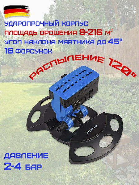 Маятниковый дождеватель HAITEC HT-SW10 позволяет поливать площади до 216 м2. Структура дождевателя обеспечивает беззаботный полив, а широкая подставка обеспечивает надежное крепление на мягкой поверхности. Через системный разъем могут быть подключены другие дождеватели или другие устройства системы орошения. С помощью маятникового оросителя HT-SW10 можно индивидуально настроить ширину, длину и расход воды, что позволяет поливать площади от 9 до 216 м² и регулировать угол наклона маятника до 45 градусов. Максимальный угол распыления 120°. Давление воды должно составлять не менее 4 бар, чтобы обеспечить достаточное количество жидкости для 16 водяных форсунок. Вариативное применение: переменная настройка позволяет маятниковому дождевателю «поворачиваться» до 45 градусов для орошения как небольших, так и больших площадей. Изготовлен из прочного и долговечного ABS пластика, обеспечивающего защиту от ультрафиолетового излучения, что позволяет не убирать его с газона каждый раз после использования. Прилагаемый адаптер 1/2 " позволяет подключать несколько шлангов и других адаптеров. Системное соединение позволяет подключать дождеватель последовательно с другими системами орошения. Благодаря широкому основанию маятниковый ороситель устойчив и при необходимости может использоваться в разных местах. Площадь орошения 9-216 м² (при 4 барах). Преимущества: - встроенный фильтр для воды - 16 водяных форсунок - регулировка угла распыления - регулировка положения форсунок - переключатель расхода воды в нижней части. Может сочетаться со всеми компонентами системы орошения HAITEC.