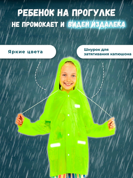 Плащ-дождевик Плащ дождевик детский предназначен для мальчиков и девочек. Свободные рукава реглан, 2 кармана с клапанами и капюшон на завязках - всё это предусмотрено, чтобы такой одеждой можно было удобно пользоваться в дождь. Его можно надевать поверх любой другой верхней одежды. Детский дождевик с капюшоном выполнен из мягкого, но при этом достаточно прочного материала. К дождевику прилагаются 6 штук тканевых светоотражателей на супер-клее размером 2,5 х 10 см. Светоотражатели рекомендуется наклеивать так, чтобы их было видно со всех сторон. Наличие светоотражающих элементов спереди, сзади и на рукавах, сделают Вашего ребёнка заметным для водителя в условиях плохой видимости, возникающей тёмное время суток и пасмурную погоду, а это повышает безопасность и снижает риск травматизма на дорогах. Дождевик для детей полностью соответствует требования ГОСТ