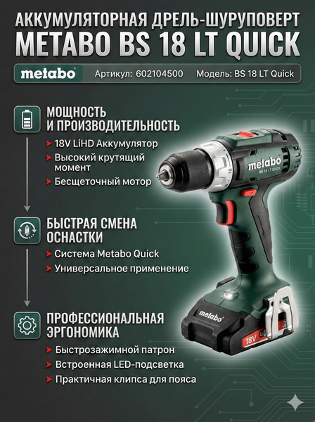 Аккумуляторная дрель-шуруповёрт Metabo BS 18 LT Quick (602104500) Аккумуляторная дрель-шуруповёрт Metabo BS 18 LT Quick — универсальный профессиональный инструмент для сверления и закручивания крепежа. Оснащена системой Metabo Quick для быстрой смены патрона и оснастки без инструмента, что особенно удобно при монтажных работах и частой смене операций. 18-вольтовая аккумуляторная система обеспечивает высокую производительность и мобильность на стройплощадке и в мастерской. Преимущества: Аккумуляторная система 18 В — мощность и свобода работы без проводов Система Metabo Quick — быстрая замена патрона и насадок Универсальность — сверление и закручивание в одном инструменте ✋ Эргономичный корпус — удобный хват и точный контроль Аккуратная работа с крепежом — стабильный результат Надёжное качество Metabo — рассчитана на регулярную нагрузку Применение: сверление дерева и металла закручивание и выкручивание шурупов монтажные и сборочные работы профессиональное и интенсивное бытовое использование Характеристики: Тип инструмента: аккумуляторная дрель-шуруповёрт Питание: аккумулятор Напряжение: 18 В Система быстрой смены: Metabo Quick Назначение: сверление, закручивание крепежа Класс: профессиональный Артикул: 602104500 Комплектация: аккумуляторная дрель-шуруповёрт Metabo BS 18 LT Quick инструкция по эксплуатации упаковка (коробка)