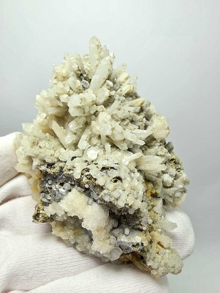Друза кристаллов кварца с кальцитом и пиритом, природная. Камень не обрабатывался, только природные кристаллы и грани! Размер: 93х62х54 мм, вес 250 г. Месторождение Россия, Дальнегорск. Минерал кварц образует кристаллы, сплошные массы различной плотности и зернистости (от крупно- до скрытокристаллических), тонковолокнистые, сферолитовые, натечные (халцедон) и землистые агрегаты. Минералы группы кварца обладают целебными свойствами, привлекают любовь, удачу, успех и материальное благосостояние, развивает воображение, способствует активным мыслительным процессам. Камень натуральный, поэтому может иметь естественные трещинки, включения, неровности поверхности, рисунка, цвета, что подтверждает и подчеркивает его природное происхождение. Цвет на фото может немного отличаться, в зависимости от индивидуальных настроек монитора и освещенности. Вы приобретаете именно тот образец, что на фото. Также, в нашем магазине Вы можете приобрести другие природные минералы и окаменелости.