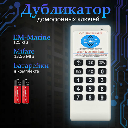 Дубликатор 07CD Это устройство используется для клонирования бесконтактных карт и брелоков с частотой 125 КГц, 250 КГц, 375 КГц и 500 КГц, а также 13,56 МГц. Данная модель может клонировать форматы Em-Marine и Mifare Classic. Устройство просто в использовании и снабжено голосовым помощником на английском языке. * Внимание! Если вы не планируете использовать дубликатор в течение долгого времени, необходимо извлечь из него батарейки на это время. ** Внимание! Перед тем как как копировать ключ/карту, необходимо убедиться в том, что частота оригинала ключа/карты совпадает с частотой ключа/карты, на которую вы собираетесь копировать. Также убедитесь, что на дубликаторе выбрана правильная частота. Карты/ключи с частотой 125 КГц и 13,56 МГц дубликатор читает и записывает во всех режимах. Как клонировать: 1. Включите устройство нажатием кнопки «Oi». Голосовой помощник сообщит, какой режим чтения/записи выбран в данный момент. 2. «R» - Расположите ключ/карту в области считывания/записи. Для того, чтобы улучшить скорость считывания/записи, расположите ключи/карты с частотой 13,56 МГц немного выше области считывания/записи, а ключи/карты с частотой 125 КГц, 250 КГц, 375 КГц,500 КГц немного ниже области считывания/записи. Нажмите кнопку «R» для считывания номера карты/ключа. При успешном считывании голосовой помощник сообщит номер ключа, при неуспешном скажет: «РИД фэлиер». В случае неуспешного чтения убедитесь, что вы прикладываете ключ/карту, на которой уже записан код и что частота и формат соответствует тем форматам, которые поддерживает данный дубликатор. Если все верно, попробуйте повторить эту операцию снова. 3. «W» - После того, как вы считали ключ/карту, с которой вам необходимо сделать копию, расположите ключ/карту, на которую вы хотите скопировать оригинал, в области считывания/записи. Нажмите кнопку «W» для записи. Когда запись будет произведена, голосовой помощник сообщит «врайт саксэс» — это означает, что запись прошла успешно. Если запись не пройдет, голосовой помощник скажет: «врайт фэлиер». В этом случае убедитесь, что вы используете заготовку, позволяющую делать на нее копию других ключей/карт, и что частота заготовки совпадает с частотой оригинала. * Для записи ключей 125 КГц используйте заготовку Proxy T5577 (код товара на Озон 878130879), для 13,56 МГЦ – заготовку Mifare Zero (код товара на Озон 880359269) 4. «S» - вы можете выбирать частоту, с которой собираетесь работать. Это 125 КГц, 250 КГц, 375 КГц,500 КГц. 13,56 МГц выбирать не нужно, она включена всегда параллельно. 5. «С» - нажатием этой кнопки вы вводите дубликатор в режим, в котором вы можете записать на ключ/карту произвольный код. После входа в этот режим, с помощью наборной панели введите номер ключа/карты, который вы хотите записать на заготовку, и нажмите еще раз кнопку «C». Затем приложите заготовку в области чтения/записи для записи введенного вами кода и нажмите кнопку «W». Когда запись будет произведена, голосовой помощник сообщит «врайт саксэс» — это означает, что запись прошла успешно. Если запись не пройдет, голосовой помощник скажет: «врайт фэлиер». В этом случае убедитесь, что вы используете заготовку, позволяющую делать на нее копию других ключей/карт, и что частота заготовки совпадает с частотой оригинала. 6. Необходимо учитывать, что данный прибор может копировать не все ключи и форматы. Например, формат Mifare Ultralight не поддерживает