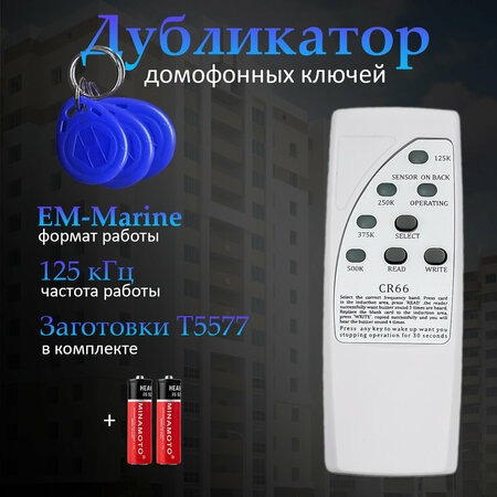 Компактный программатор для копирования бесконтактных карт доступа и домофонных ключей формата EM-Marine с частотой работы 125 КГц. Также возможно копирование карт и брелков работающих на частотах 250, 375, 500 кГц. Работает автономно (для работы не нужен компьютер). Конструкция изделия защищена от механических повреждений. Питание от 2-х пальчиковых батареек типоразмера ААА, которые идут в комплекте. Дубликатор перезаписывает данные в течение 5 секунд. управление: 1. Поместите карту/ключ в область считывания на обратной стороне прибора. Выберите соответствующую частоту "SELECT". 2. Нажмите кнопку "READ", прозвучит короткий звуковой сигнал, номер карты был сохранен. 3. Поместите пустую карту или брелок(заготовку) для записи на область чтения карт на обратной стороне прибора. 4. Нажмите кнопку "WRITE", прозвучит короткий звуковой сигнал, дубликат успешно записан. Прибор автоматически засыпает без работы в течении 30 секунд и пробуждается, прикладыванием идентификатора.