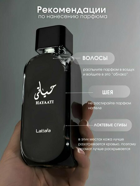 Hayati — это аромат, который объединяет в себе нежность, романтику, женственность и современность. Он создан для тех женщин, которые хотят подчеркнуть свою красоту, индивидуальность и внутреннюю уверенность. Hayati — это не просто духи, это эмоция, настроение и состояние души, которое раскрывается с каждым новым вздохом аромата. С первых секунд распыления аромат встречает лёгкими и яркими верхними нотами. В их составе находятся красные ягоды, цитрусовые акценты и сладкие тропические фрукты. Благодаря этому Hayati открывается свежо, сладко и жизнерадостно. Ягодные ноты придают композиции интенсивность, а цитрусовая свежесть делает её энергичной. Такое сочетание создаёт динамичное и приятное первое впечатление. Сердце композиции — это настоящая ода женственности. В средней ноте раскрываются роза, жасмин и белые цветы. Роза символизирует нежность и красоту, жасмин добавляет страсти и элегантности, а белые цветы придают аромату мягкость и утончённость. Именно сочетание этих нот делает Hayati гармоничным и очаровательным. Аромат словно подчеркивает природную красоту женщины, её мягкость и романтичность. База аромата — теплая, чувственная и глубокая. В ней доминируют ваниль, белый мускус и древесные оттенки. Ваниль добавляет сладости и тепла, белый мускус создаёт ощущение чистоты и свежести, а древесные ноты придают стойкость и глубину. Такая база делает аромат запоминающимся и долгоиграющим: он остаётся на коже и одежде на протяжении многих часов, сохраняя свою насыщенность. Hayati идеально подходит для любого случая — будь то ежедневная работа, прогулка, романтическое свидание или праздничное мероприятие. Аромат универсален и актуален в любое время года. Он подчёркивает индивидуальность женщины, её уверенность, привлекательность и мягкость. Hayati — это запах, который создаёт настроение, добавляет очарования и делает образ завершённым. Флакон духов имеет современный и элегантный дизайн. Он удобен в руке, выглядит стильно и подчёркивает премиальность аромата. Такой парфюм станет отличным подарком для близкого человека или прекрасным дополнением к личной коллекции. В итоге Hayati — это роскошный, сладкий, женственный и тёплый аромат, который подходит женщинам любого возраста. Он делает образ более выразительным, подчёркивает природную красоту и дарит уверенность в себе. Hayati — это тот аромат, который хочется носить каждый день, ведь он создаёт вокруг обладательницы ауру нежности и очарования.