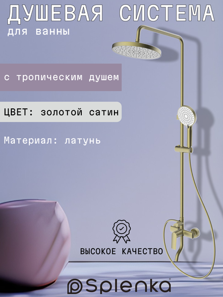 Душевая система с тропическим душем подарит комфорт и расслабление. Душевая стойка со смесителем идеально впишется в современный интерьер ванны. Цвет сатин золотой придаст элегантность помещению, создавая уютную атмосферу. Главное преимущество системы – наличие тропического душа, обеспечивающего легкость и удовольствие от принятия водных процедур. Комплект включает стойку для душа, верхний душ, смеситель, а также комплект эксцентриков и отражателей. Латунное исполнение гарантирует долговечность и устойчивость к износу. Стойка для душа фиксируется на стену ванной комнаты с помощью надежного крепления. Крепление оборудовано держателем для лейки и шлангом для душа, что делает пользование удобным и приятным. Держатель обеспечивает оптимальное размещение лейки на нужной высоте. Важно отметить материал изделия – латунь. Она характеризуется прочностью и устойчивостью к коррозии. Переключатель с керамическими пластинами позволяет легко изменять режим подачи воды, а угол поворота 360° обеспечивает максимальную гибкость при использовании. Душевой гарнитур включает все необходимые элементы для полноценного оснащения ванной комнаты. Аэратор способствует экономии воды за счет равномерного распределения потока воздуха с водой. Это обеспечивает мягкое распределение струи на кожу. Эксцентрики с отражателями выполняют не только функциональную роль, но и декоративную: они скрывают крепежные элементы системы. Керамический картридж 35мм в смесителе способствует плавному управлению температурой воды, продлевая срок службы оборудования. Тропический душ комплект превосходно подойдет как для крупных ванных комнат, так и для небольших пространств благодаря универсальности дизайна. Простота установки делает гарнитур доступным решением даже для самостоятельного монтажа. Для тех, кто предпочитает гармоничное сочетание стоимости и качества изделий, данная душевая система станет настоящей находкой.