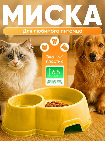 Двойная миска для кошек и собак: удобство и функциональность Двойная миска для кошек и собак станет незаменимым аксессуаром для вашего питомца. Она сочетает в себе две секции, что позволяет использовать ее для еды и воды одновременно. Миска имеет размеры 25x19,5x6,5 см, что делает ее удобной и компактной для размещения на полу или столе. Желтый цвет миски не только придает ей яркий и привлекательный вид, но и позволяет легко найти миску среди других предметов в доме. Особенности двойной миски для кошек и собак включают две секции, что позволяет использовать ее для разных нужд вашего питомца. Выбирая двойную миску для кошек и собак, вы обеспечиваете своему питомцу комфорт и удобство в использовании.