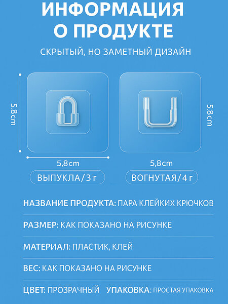 Это прозрачный самоклеящийся крючок. Он предназначен для подвешивания различных предметов на гладкие поверхности, такие как плитка, стекло или пластик, без сверления отверстий. Крючок состоит из двух частей: прозрачной клеевой основы и прикрепленного пластикового крючка. Эти крючки обычно используются в ванных комнатах, кухнях или прихожих для подвешивания полотенец, кухонной утвари, ключей и других легких предметов. Клейкая основа позволяет легко наклеивать и снимать крючок, не оставляя следов на поверхности.
