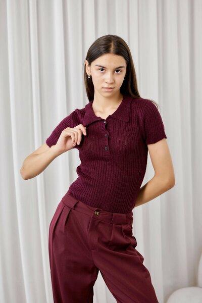 Базовый джемпер с короткими рукавами, выполненный из приятного к телу трикотажного материала в крупный рубчик. Имеет отложной воротник поло с застежкой на три пуговицы. Отлично подойдет для повседневного образа в стиле кэжуал.