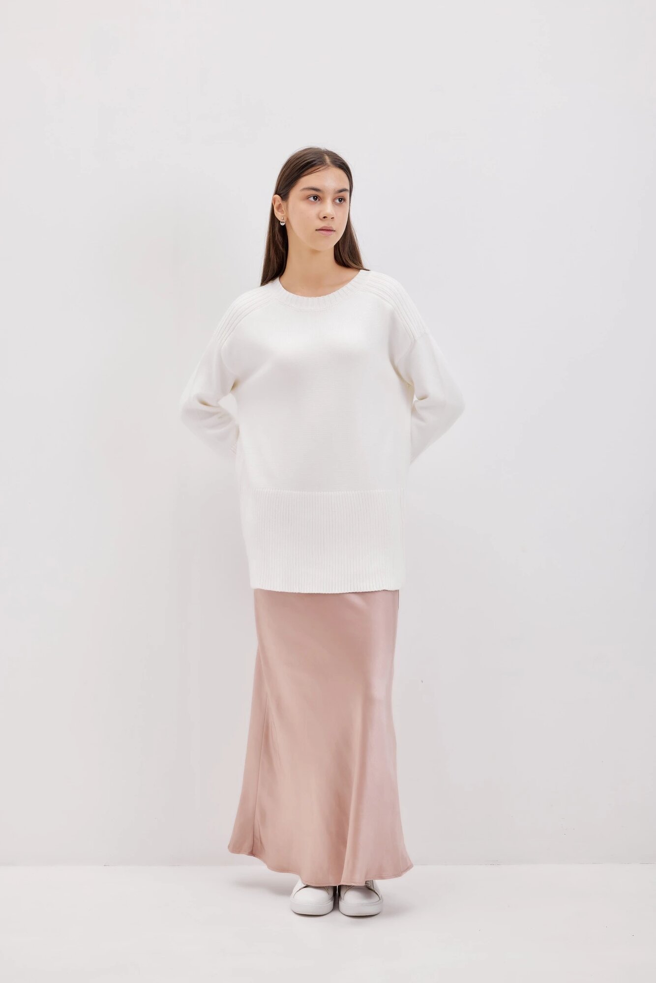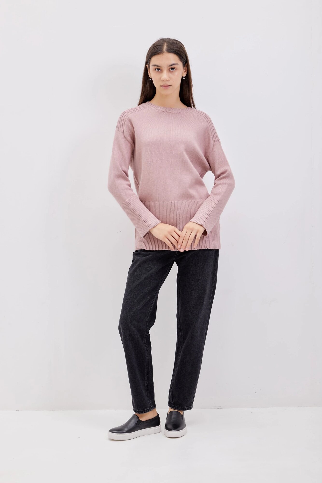 Джемпер свободного кроя с рубчатыми вставками на рукавах и по нижнему краю. Выполнен из приятного к телу вязаного трикотажа. А благодаря классической простоте модель легко можно добавить практически в любой стиль и образ.