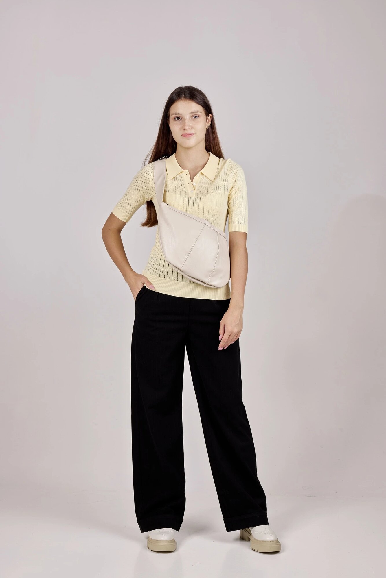Ажурный джемпер-поло с застежкой на пуговицах, прилегающего силуэта с рукавом 1/4. Имеет подчеркивающие белые линии на отложном воротнике. Модель продолжает быть популярной еще с 40-50-х годов благодаря моде на винтажный и ретро стиль. Подобный джемпер можно с легкостью использовать в современном летне-весеннем и даже осеннем гардеробе.