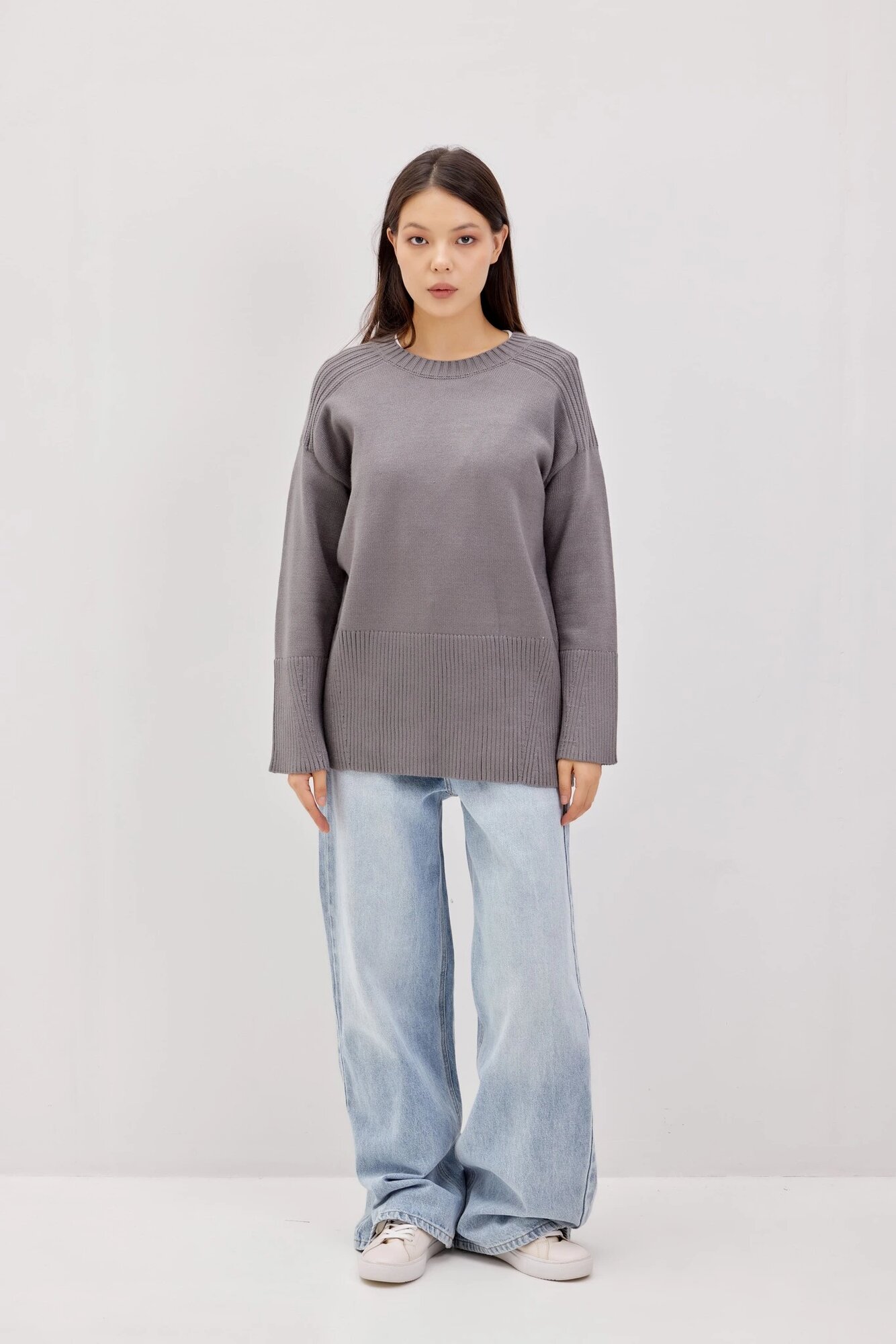 Джемпер свободного кроя с рубчатыми вставками на рукавах и по нижнему краю. Выполнен из приятного к телу вязаного трикотажа. А благодаря классической простоте модель легко можно добавить практически в любой стиль и образ.