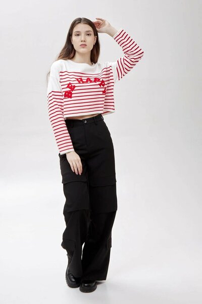 Укороченный джемпер со свободными длинными рукавами в полоску с принтом. Простая, но комфортная модель, что дополнит любой повседневный образ.