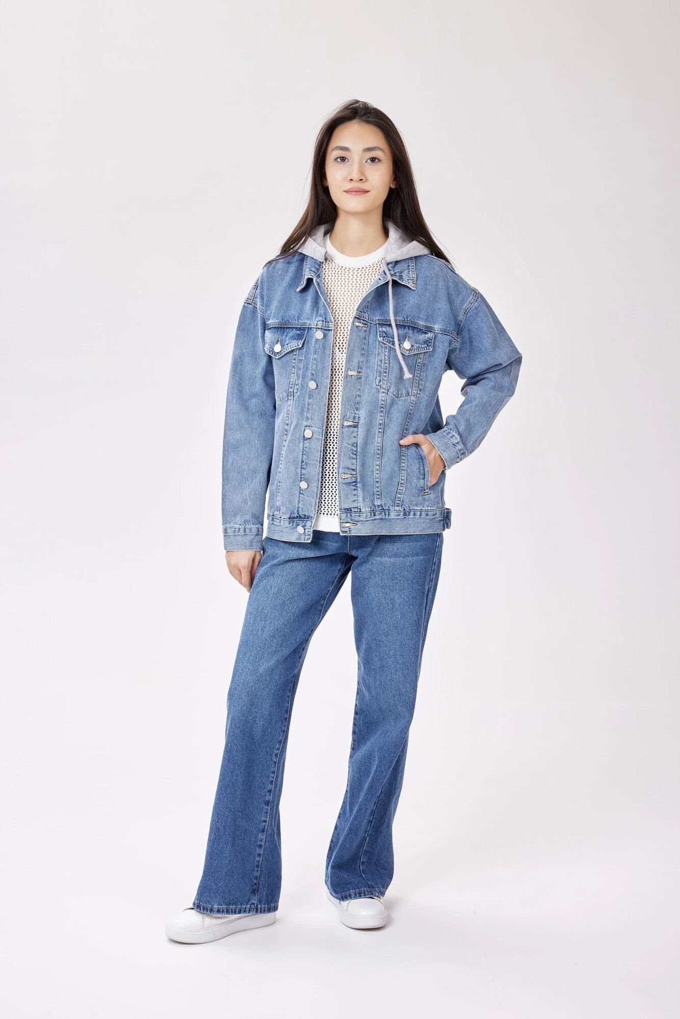 Джинсовая куртка классического прямого кроя с капюшоном и накладными карманами с клапанами. Выполнена из плотного, непродуваемого денима. Джинсовку, подходящую и на лето, и на демисезон, легко комбинировать с любыми джинсами: скини, бойфрендами, клеш, рваными и многими другими. Подойдет как подросткам, так и взрослым.