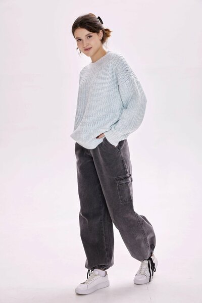 Свободные джинсы парашюты с утяжками на талии и по низу штанин. Трендовая модель, идеально подходящая для создания стильных образов в уличном стиле. Также имеет застежку на молнию и пуговицу.