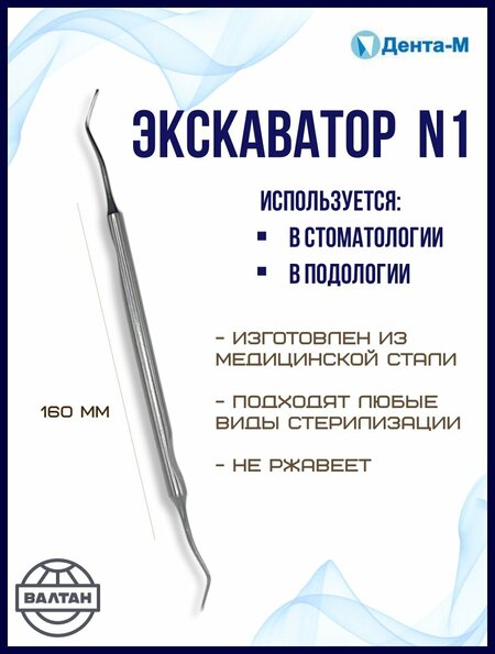 Экскаватор стоматологический служит для извлечения из кариозной полости размягченного дентина, очистки эмали, снятия временного пломбировочного материала и удаления из полостей зуба фрагментов пищи и мягкого налета применяется стоматологический экскаватор. Стоматологический инструмент изготовлен из высококачественного материала - медицинской стали. Инструмент может также использоваться как кюретка для педикюра и вросших ногтей. Допускаются любые виды стерилизации и обработки. Медицинские стоматологические инструменты могут использоваться в медицине, студентами-медиками, а также подойдут для любой деятельности, в бьюти сфере, для мастеров красоты, подологов. Каждая из симметричных рабочих частей двустороннего экскаватора имеет вогнутую форму с острыми краями, которые позволяют атравматично удалять размягченные ткани зуба из кариозной поверхности. Функциональные стержни инструмента имеют изгибы по плоскости, что способствует введению экскаватора в глубокие и труднодоступные участки полости рта и ногтей. Ручка имеет впадину-упор, благодаря чему надежно фиксирует инструмент в руке, что позволяет уверенно проводить любые манипуляции. Размеры: Экскаватор №1: длина - 160 мм, длина рабочей части - 2.0 мм, угол - 30˚, ширина рабочей части - 1.0 мм.