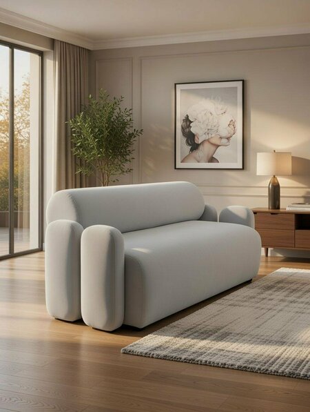 Всё то же облако, только компактнее: сверхмягкие округлые подлокотники-валики, плавно закруглённая спинка и никаких острых линий. В светло-сером или тёплом бежевом велюре он выглядит как уютный кокон, который случайно оказался в твоей гостиной — и теперь без него невозможно представить интерьер