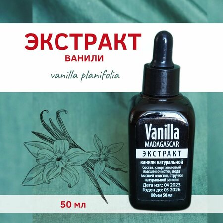 Аромат ванили и сладкая выпечка неразрывно связаны между собой. Ванильные нотки – это и булочки, и кексы, и бисквит, и печенье, и кремы. Чем лучше и натуральнее ваниль, тем более благородной и изысканной получается выпечка. Экстракт ванили в нашем магазине позволит добавить этой изысканности в любое ваше блюдо. Удобный дозатор-пипетка и закручивающаяся крышка, позволят точно отмерить нужное количество вплоть до капли и сохраняет весь аромат надолго. А натуральная ваниль в составе придаст любому десерту восхитительный аромат, легкую сладость, а также уравновесит все вкусы. Экстракт ванили - это спиртовая настойка на натуральных стручках мадагаскарской ванили. Он великолепный натуральный ароматизатор для кремов, муссов, напитков, пропиток и т. д. но! Не рекомендуем использовать для ароматизации теста, так как экстракт ванили неустойчив к высокой температуре. Создавайте теплые воспоминания и семейные традиции вместе с нами и вашими кулинарными шедеврами! Объем: 50 мл. Состав: спирт этиловый высшей очистки, вода высшей очистки, стручки натуральной ванили. Хранить в защищенном от света месте при температуре до 25 °С и относительной влажности воздуха не более 70%