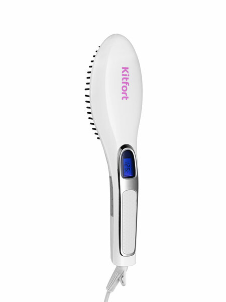 Электрическая расчёска-выпрямитель Kitfort КТ-3219 предназначена для быстрого и лёгкого выпрямления волос без потери объёма. Зубцы расчёски нагреваются, благодаря чему выпрямляют ваши волосы, делая их гладкими и блестящими. По внешнему краю проходит ряд пластиковых зубцов, которые не нагреваются, чтоюы вы не обожглись. На нагревающиеся зубцы сверху установлены силиконовые вставки, которые защитят вашу кожу головы от ожогов, а также выполняют массаж. На корпусе расчёски-выпрямителя расположен дисплей, который отображает заданную температуру, а затем – текущую температуру нагрева. Нагрев расчёски занимает от 1 до 3-х минут. Кнопки «+» и «-», увеличивают и уменьшают нагрев, позволяя установить нужную температуру зубцов от 80 до 230°С с шагом 5°С. Удобное расположение кнопок сбоку ручки предохраняет от случайного нажатия во время укладки волос. Шнур оснащён защитой от перегиба и петлёй, что позволяет хранить расчёску-выпрямитель на крючке. Вращение шнура на 360° обеспечивает удобство в использовании – провод не наматывается и не путается при перевороте расчёски, а поворачивается вместе с ней. Для тонких, пористых или ломких волос рекомендуетсфя устанавливать температуру 140-170°С, для нормальных – 160-190°С, для жёстких и густых – 180-220°С. Расчёсыввайте небольшие пряди волос плавными движениями от корней к кончикам.