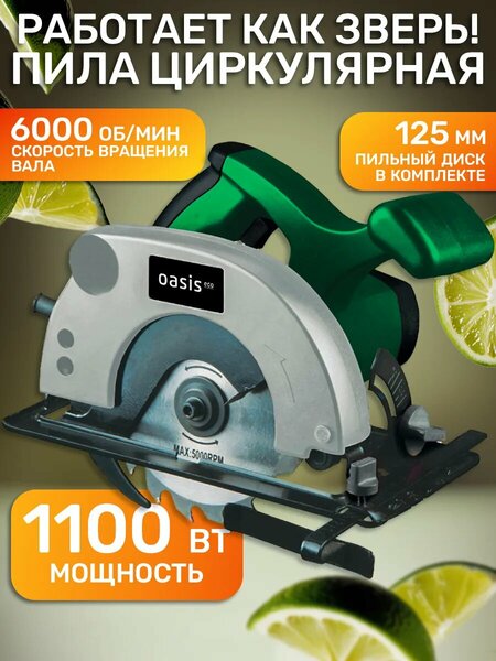 Электрическая циркулярная пила Oasis – это бытовой инструмент, предназначенный для продольного и поперечного распила под прямым углом, либо под углом до 45 древесины разных пород деревьев и изделий из древесных материалов. Высокая надёжность циркулярных пил Oasis достигается за счёт прочного корпуса и качественных материалов изготовления. Широкий диапазон настроек работы инструмента и эргономичная рукоятка делают работу с пилой Oasis максимально удобной. Комплектация: Циркулярная пила; Пильный диск; Ключ установки диска; Угольная щётка – 2 шт. Направляющая линейка; Руководство по эксплуатации; Упор; Винты - 2 шт. Гарантия 1 год (+1 год при выполнении условий расширенной гарантии). Мощность, 1100 Вт Параметры электропитания, 220/50 В/Гц Размер пильного диска, 140 мм Скорость вращения вала, 6000 об/мин Максимальная глубина пропила под 90˚, 45 мм Максимальная глубина пропила под 45˚, 30 мм Преимущества: Регулировка глубины пропила и угла среза позволяет выполнить различные по сложности операции и работать с различными материалами; Система быстрой замены щёток для оперативного обслуживания инструмента; Возможность подключения пылесоса для эффективного удаления пыли с рабочей поверхности; Защитный кожух с регулировкой положения обеспечивает безопасность во время работы; Виброгасящие накладки на рукоятках повышают комфорт во время работы; Конструкция подошвы обеспечивает превосходный обзор линии реза для точного пропила; Параллельный упор обеспечивает точный и ровный пропил; Она оснащена направляющей шиной, которая помогает убедиться, что вы режете прямо по линии. Она быстро станет вашим любимым инструментом в доме или на стройке. Это идеальный подарок для всех мужчин-мастеров, которые хотят иметь лучшие инструменты в своей коллекции. Электрический сетевой инструмент нужен, если у вас идет ремонт и строительство. Такая электропила пилит как станок. Это электроинструмент, а не аккумуляторный инструмент. Нужные электроинструменты строительные и инструменты в набор.