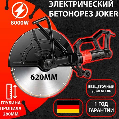 Электрический бетонорез JOKER 625 подходит для реза кирпича, бетона, железобетона и других твердых материалов. Предназначен для работы с дисками диаметром до 620мм. Максимальная глубина обработки составляет 280 мм. Устройство оборудовано мощным электродвигателем 8000w. Конструкцией предусмотрена система подачи жидкости. Направляющие ролики обеспечивают удобную подачу резчика. Возможность подключения пылесоса позволяет ощутимо уменьшить пыль в помещении при сухой резке. Есть возможность использовать воду во время работы - это значительно уменьшит пылеобразование. Бетонорез Joker снабжен системой подачи воды в зону реза - вода подается с двух сторон! Данная функция также позволяет значительно увеличить ресурс алмазного диска. На бетонорез может быть установлена опорная платформа, позволяющая регулировать заглубление диска, либо направляющие ролики для более легкой подачи машины во время реза. Специальная конструкция пусковой клавиши защитит Вас от непреднамеренного включения инструмента. Для установки или замены диска нет необходимости снимать защитный кожух. Но, если возникла необходимость почистить внутреннее пространство кожуха, то нужно всего лишь отстегнуть шесть быстросъемных крепежных защелок и кожух открыт.