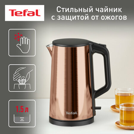 Мощность - 2000 Вт Объем - 1.5 л Материал корпуса - Нержавеющая сталь Материал ручки - Пластик Фильтр против накипи - Есть Блокировка включения без воды - Есть Нагревательная система - Дисковый нагреватель Цвет - Бронза, черный Функциональный электрический чайник Tefal Glorious имеет особый дизайн и будет прекрасным дополнением для любой кухни. Мы продумали все детали, чтобы процесс приготовления чая был безупречным: двойные стенки корпуса позволяют чайнику оставаться прохладным снаружи и обеспечивают долгий срок службы, система автоматического открывания крышки и автоматического отключения упрощает кипячение воды, съемный фильтр против накипи, а также объем 1,5 л идеально подходят для приготовления любых напитков. Двойные стенки чайника защищают от ожоговКорпус с двойными стенками отлично поддерживает температуру воды и предотвращает нагревание внешних стенок даже во время кипячения, обеспечивая защиту от ожогов для комфортного и безопасного использования. Удобное открывание крышкиСистема автоматического открывания крышки одним нажатием и широкое горлышко позволяют удобно наполнять и легко чистить чайник. Съемный фильтр против накипиФильтр против накипи, установленный в носике чайника, не дает частицам накипи попасть с водой в чашку, легко снимается и чистится. Вращение на 360°Благодаря основанию с поворотом на 360 градусов чайник надежно стоит на подставке, легко поднимается, а также легко устанавливается. Кнопка включения с подсветкойЧайник можно включать и выключать в любое время, а после вскипания воды он автоматически отключается. Внутренняя колба из нержавеющей сталиВнутреннюю колбу из нержавеющей стали легко мыть в труднодоступных местах. Объем 1,5 лБольшого объема 1,5 л хватит для приготовления чая или кофе для вас, ваших близких и гостей.