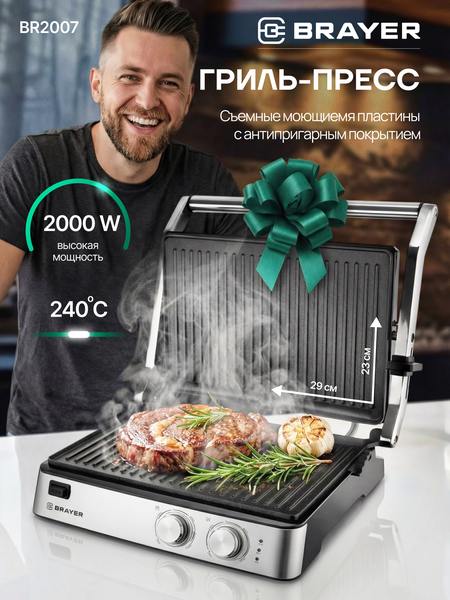 Электрический гриль-пресс BRAYER BR2007 – профессиональная мощность для идеальной прожарки.