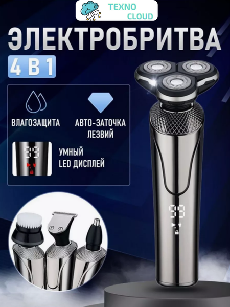 Многофункциональная электробритва 4 в 1 — это идеальный прибор для полноценного мужского ухода в домашних условиях. В комплекте четыре насадки: для бритья, подравнивания бороды, чистки лица и удаления волос в носу. Эргономичный дизайн, водонепроницаемый корпус и умный LED-дисплей делают её незаменимым аксессуаром для ежедневного использования. Основные характеристики: ✅ 4 насадки: Бритвенная головка с 3 плавающими ножами Триммер для бороды и усов Щетка для умывания и очистки пор Триммер для носа Влагозащита — подходит для влажного и сухого бритья Автоматическая заточка лезвий Мощный аккумулятор — обеспечивает длительную автономную работу Интеллектуальный LED-дисплей с индикацией заряда, блокировкой, напоминанием о чистке и зарядке Ультратонкая сетка и плавающие головки в 4 направлениях для идеального результата USB-зарядка — удобная зарядка от любого устройства Комплектация: Электробритва 4 насадки Кабель USB Type-C Щеточка для очистки Защитная крышка Упаковка (подходит для подарка) Преимущества: Уход за кожей и бородой в одном устройстве Подходит для чувствительной кожи Легкость в использовании и очистке Современный мужской дизайн Отличный выбор в качестве подарка