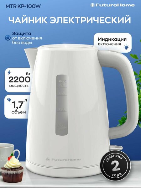 Электрический чайник FuturoHome MTR KP-100W - безупречный вкус в каждой чашке! В быстром темпе современной жизни, порой, не остается времени даже на привычные маленькие радости. Будь то встреча с друзьями, чтение любимой книги или заваривание кофе в турке. Именно поэтому мы стараемся ценить мгновения безмятежности, когда можно просто наслаждаться жизнью. Например, чашечкой утреннего кофе или чая. В такие моменты нужно всего лишь нажать на пуск, а чайник все сделает сам. И вот через считанные минуты можно остаться наедине со своими мыслями. Электрический чайник MTR KP-100W создан именно для таких моментов. Особенности модели чайника MTR KP-100W Вместительный объем 1.7 литра. Идеально подходит для больших семей и компаний, позволяя приготовить достаточный объем воды за одно кипячение. Мощный и быстрый нагрев (1850-2200 Вт). Экономьте время и наслаждайтесь горячим напитком уже через несколько минут. Скрытый нагревательный элемент. Легко очищается от накипи и обеспечивает более эффективный нагрев воды. Безопасный пищевой пластик. Корпус изготовлен из высококачественного пищевого пластика, не выделяющего вредных веществ при нагревании. Длительная гарантия 2 года. Уверенность в качестве и надежности от производителя. Оптимальная длина шнура 70 см. Обеспечивает комфортное размещение чайника на кухне. Автоматическое отключение при закипании. Безопасность превыше всего – чайник автоматически отключается после закипания воды. Защита от включения без воды. Предотвращает появление неисправностей и продлевает срок службы чайника. Поворотное основание 360 градусов. Удобство использования для правшей и левшей. Не упустите возможность обзавестись надежным и функциональным чайником MTR KP-100W! Добавьте его в корзину прямо сейчас и наслаждайтесь горячими напитками без лишних хлопот!