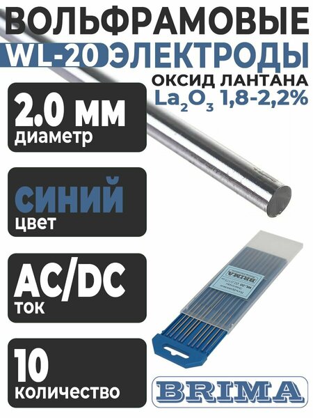 Электроды вольфрамовые WL-20 BRIMA 0010151 предназначены для аргонодуговой сварки. Изготовлены из вольфрама, который имеет высокую температуру плавления (свыше 3000 °С), а также высокую температуру кипения (около 5900 °С), что обеспечивает небольшой расход вольфрамового электрода на 1 погонный метр сварного шва. Вольфрамовые электроды для tig сварки используются при работах с высоколегированными сталями, алюминием, медью, бронзой. В качестве легирующей добавки выступает оксид лантана La2O3 (1,8-2,2%). Имеют легкое первоначальное и повторное зажигание дуги, низкую склонность к прожогам, а также выдерживают высокую токовую нагрузку и обеспечивают стабильное горение дуги.