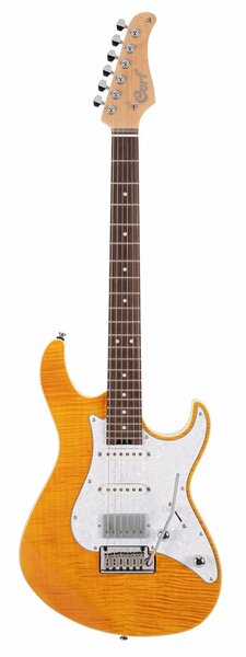 Электрогитара G280 Select Amber производителя Cort обладает универсальным звучанием, что позволяет исполнять разные стили музыки. Технические параметры находятся на высоком уровне, что делает данную модель достаточно популярной среди многих музыкантов. Особенности: Корпус сделан из ольхи и обеспечивает насыщенный звук в среднем и высоком диапазоне. Верх корпуса выполнен из волнистого клена с эффектной текстурой, которая добавляет инструменту оригинальности. Перламутровый пикгард защищает поверхность деки при использовании медиатора. Гриф из клена имеет удобный эргономичный профиль, что важно при длительной игре на электрогитаре. Древесина грифа устойчива к воздействию влажности и температуры. Накладка грифа сделана из палисандра и вмещает 22 лада, на поверхности расположены маркеры, а удобный доступ к верхним ладам создает нижний вырез на корпусе. Для настройки инструмента, натяжения или замены струн используется колковая механика с блокировкой. А еще в модели применяется стальной бридж тремоло CFA-III, обеспечивающий стабильный строй в композициях. Звукосниматели выполнены по схеме H-S-S (модели VTH-77 и VTS-63 соответственно), компоненты создают мощный тембр и чистое звучание. Для удобной регулировки на корпусе есть рукоятки громкости, тона и переключатель звукоснимателей.