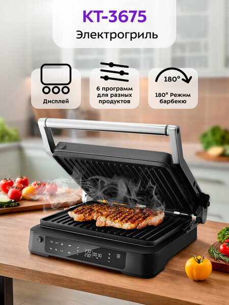 Электрогриль КТ-3675 предназначен для приготовления мяса, рыбы, овощей, сосисок, бутербродов, панини, сэндвичей, гренок, тостов и многих других блюд. Высокая температура гриля способствует быстрому приготовлению продуктов. Прибор оснащён панелью управления, с помощью которой вы сможете установить желаемую температуру приготовления (для каждой панели можно установить свою температуру), время таймера, а также включить приготовление в одной из 6 предусмотренных режимов. В двустороннем режиме электрогриль закрывается крышкой, что сокращает время готовки, так как продукты готовятся с двух сторон сразу. В одностороннем режиме крышка гриля откидывается на 180°, благодаря чему продукты можно выложить сразу на две панели. На панели нанесено антипригарное покрытие, что позволяет готовить с минимальным количеством масла. Такое покрытие также облегчает процесс чистки панелей. Панели у прибора съёмные. Данная модель оснащена поддоном для слива жира и сока, которые выделяются в процессе приготовления продуктов. Жир и сок стекают через слив для жира и сока в поддон для жидкости. Специальный фиксатор сбоку гриля удерживает крышку в закрытом положении, что делает готовку, транспортировку и хранение более удобными. Он также позволяет фиксировать крышку в приоткрытом положении на разном уровне.