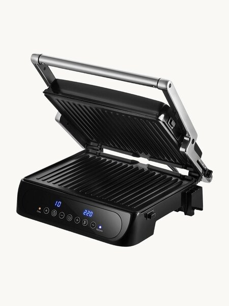 Сразу отмечу ключевые плюсы, которые для меня оказались наиболее значимыми. Во‑первых, съёмные панели с антипригарным покрытием — это действительно удобно: после готовки их легко снять и вымыть, ничего не пригорает. Во‑вторых, предусмотрен лоток для сбора жира, что существенно упрощает уборку — столешница остаётся чистой, а излишки жира аккуратно собираются в ёмкость. В‑третьих, гриль быстро нагревается благодаря мощности в 2000 Вт: это заметно ускоряет процесс приготовления. Ещё одна полезная функция — регулировка высоты крышки, которая позволяет подстраивать прибор под толщину продуктов: можно жарить как тонкие ломтики овощей, так и более толстые куски мяса. Управление предельно простое: разобраться можно за минуту, никаких лишних кнопок или сложных настроек.