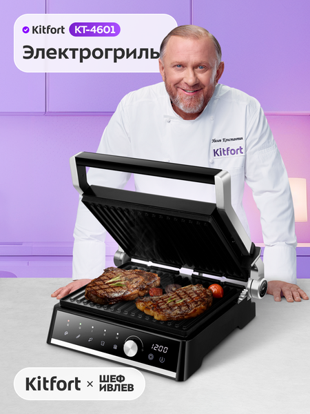 Универсальный помощник! Электрогриль КТ-4601 предназначен для приготовления мяса, рыбы, овощей, сосисок, бутербродов, панини, сэндвичей, гренок, тостов и многих других блюд. Высокая температура гриля способствует быстрому приготовлению продуктов. Режим барбекю Конструкция гриля позволяет готовить в одностороннем режиме. Крышка гриля откидывается при помощи кнопки 180°, благодаря чему гриль превращается в большую жаровню, а продукты можно выложить сразу на две панели. Быстрое и удобное приготовление любимых блюд В двустороннем режиме электрогриль закрывается крышкой, так что продукты находятся между нагреваемых панелей и готовятся с двух сторон сразу. Такой способ позволяет сократить время готовки и не требует переворачивания продуктов во время приготовления. Выбор режима приготовления Гриль имеет 5 режимов приготовления. Каждый из них предназначен для идеального приготовления нужного продукта: прибор выставляет нужную температуру и засекает время. Также определяет уровень «прожаренности», отображая его индикаторами на панели. Простое управление Для тех, кто любит контролировать весь процесс приготовления, на устройстве предусмотрена возможность самостоятельной настройки времени и температуры при помощи регулятора. На дисплее отображаются температура панелей и время. Антипригарное покрытие На панели нанесено антипригарное покрытие, что позволяет готовить с минимальным количеством масла или без него. Такое покрытие также облегчает процесс чистки панелей. Съёмные панели Панели у электрогриля съёмные. Обе панели имеют ребристую поверхность, что позволит вам готовить продукты с характерным для гриля узором. Слив жира и сока в поддон Данная модель оснащена поддоном для слива жира и сока, которые выделяются в процессе приготовления продуктов. Жир и сок стекают через слив для жира и сока в поддон для жидкости.