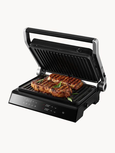 Для сочных блюд каждый день! Контактный электрический гриль Kitfort КТ-4616 станет вашим незаменимым помощником на кухне. С его помощью вы сможете приготовить разнообразные блюда: стейки, сэндвичи, тосты и т. д. Высокая температура способствует быстрому приготовлению продуктов. Регулируйте температуру под себя! Панель управления интуитивно понятна, гриль имеет 5 режимов приготовления. Вы можете установить температуру нагрева панелей до 230 °С с шагом 5 °С. С помощью кнопок настраивается время таймера от 1 минуты до 4 часов с шагом 1 минута. Отдельная настройка каждой панели Вы можете настроить температуру нижней и верхней панелей от 90 до 230 °С с шагом 5 °С. После выбора нужной температуры значение на дисплее мигнет 2 раза, а затем будет гореть непрерывно. Начнется нагрев панели, для которой вы установили температуру. Режим барбекю Конструкция гриля позволяет готовить в двух режимах: двустороннем и одностороннем. Чтобы откинуть крышку и готовить в одностороннем режиме, необходимо открыть крышку, перевести фиксатор «180°» в верхнее положение, и удерживая фиксатор, опустить крышку. Продуманные детали Съёмные панели с ребристой поверхностью облегчают чистку после приготовления. Антипригарное покрытие позволяет готовить с минимальным количеством масла. Съёмный поддон для сбора жира В процессе приготовления продуктов образуются жир и сок, которые стекают в поддон для сбора жира. Просто выньте поддон и помойте его с моющим средством. Ваша кухня останется чистой!