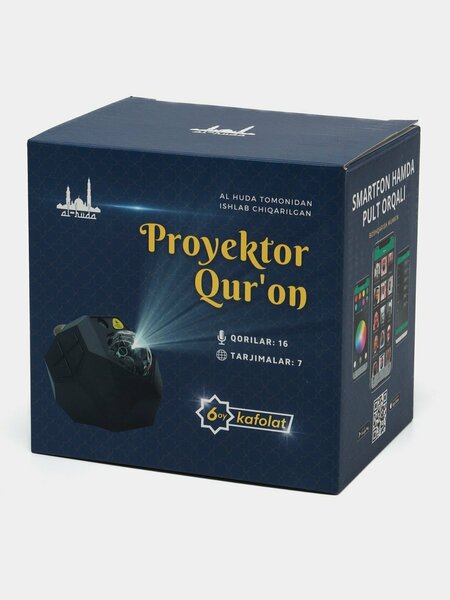 Замечательная электронная лампа «Проектор Корана» от бренда Al Huda Наш проектор Корана включает в себя следующие функции: 1. 16 чтений Священного Корана; 2. Перевод Священного Корана на 16 языков, включая переводы на узбекский язык шейха Мухаммада Садика Мухаммада Юсуфа; 3. Включены хадисы «Сахих аль-Бухари» и «Сахих аль-Муслим»; 4. Аяты рукья; 5. Полная аудиозапись книги «История Мухаммада» Алиханта Согуни; 6. Аль-Асма аль-Хусна, то есть 99 прекрасных имён Аллаха, полностью с толкованиями на узбекском языке; 7. Инструкции по молитвам доступны на 5 языках: узбекском, русском, казахском, киргизском и таджикском, с отдельными женскими и мужскими голосами; 8. Также доступна функция поиска по аяту и суре. Вы можете управлять проектором с помощью пульта дистанционного управления и смартфона.