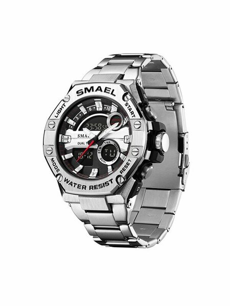 Часы наручные мужские электронные SMAEL, коллекция Steel Rocket / 2023. Модные и стильные металлические часы с круглым многоугольным корпусом из стали и пластика диаметром 45 мм и толщиной 18 мм. Внушительный вес изделия 165гр. Ремешок из нержавеющей стали, имеет длину 24 см и подходит для обхвата запястья от 13 до 21 см. Эти большие часы объединяют в себе кварцевые и электронные механизмы в одном корпусе. Данная механика позволяет настроить двойное время. Многофункциональные повседневные обычные часы SMAEL в стиле тактические, Россия. Классика как военные армейские или командирские они оснащены будильником, почасовым таймером, секундомером, сплит-хронографом (секундомер, позволяющий измерять параллельные временные интервалы), электронной подсветкой дисплея (полная синяя) и люминесцентной подсветкой стрелок. Водонепроницаемые ручные часы SMAEL выдерживают давление до 5АТМ (атмосфер), они защищены от дождя или кратковременного погружения. Классические и спортивные часы для мужчин SMAEL органично дополняют как активный спорт стиль, так и повседневный образ. Подарок военному папе, мужу или брату.