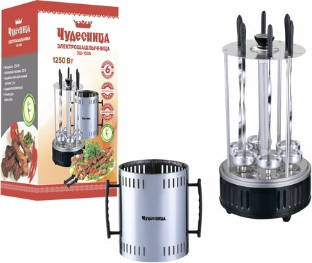 Электрошашлычница Чудесница ЭШ-1006 идеально подходит для приготовления шашлыка в домашних условиях. С нею можно планировать разовое приготовление до 1,2 кг шашлыка дома в любое удобное время и погодные условия. За считанные минуты керамический нагревательный элемент достигает оптимальной температуры. Автоматического вращения шампуров обеспечивает равномерное обжаривание продукта со всех сторон. Время приготовления шашлыка из рыбы составит 15 минут, из курицы - 20 минут, из свинины - 30 минут. В комплекте электрошашлычницы поставляется 6 шампуров длиной - 31см и 6 чашечек для стекания сока и жира, изготовленные из высококачественной пищевой нержавеющей стали, оснащенными удобными и пластиковыми ручками. Корпус - из высококачественной нержавеющей стали и оборудован пластиковыми ручками. Шашлычница ЭШ-1006 Чудесница проста в использовании.